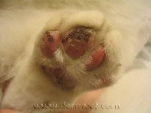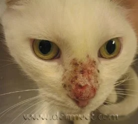 This disease generally presents seasonally with the increased presence of mosquitoes. There is no age or breed predilection, however, the majority of affected cats are indoor/outdoor cats. Lesions generally occur on non-haired or poorly-haired areas such as the bridge of the nose, ear flaps, or pads of the feet. Lesions usually present as small raised nodules (papules), that progress to plaques that often have an erosive or ulcerated, crusted appearance.